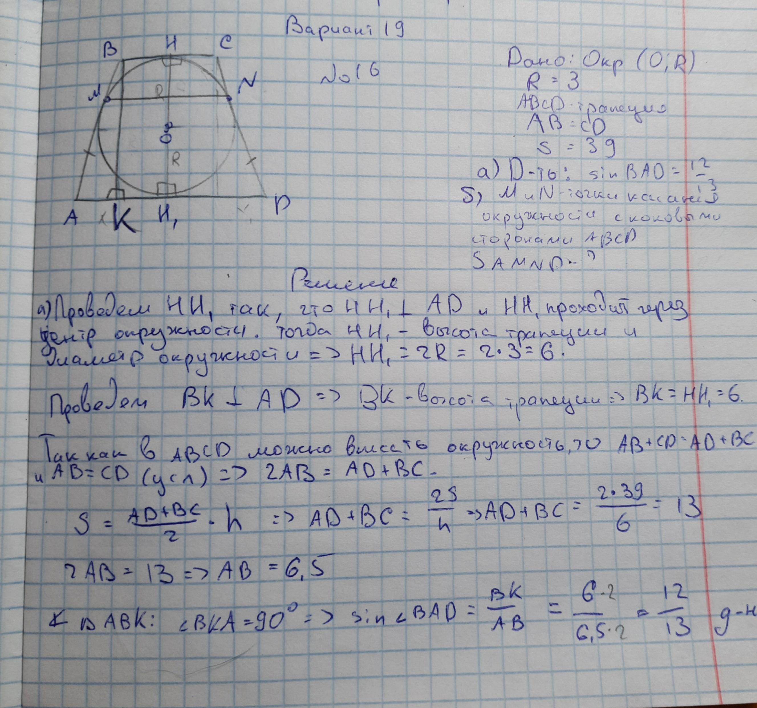 ABCD (AD - большее основание), площадь которой равна 39.