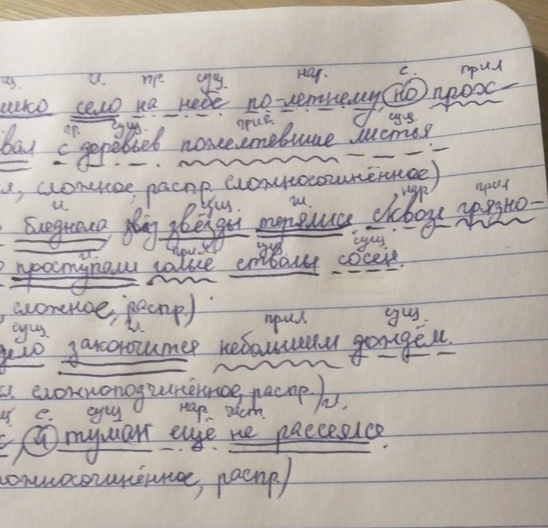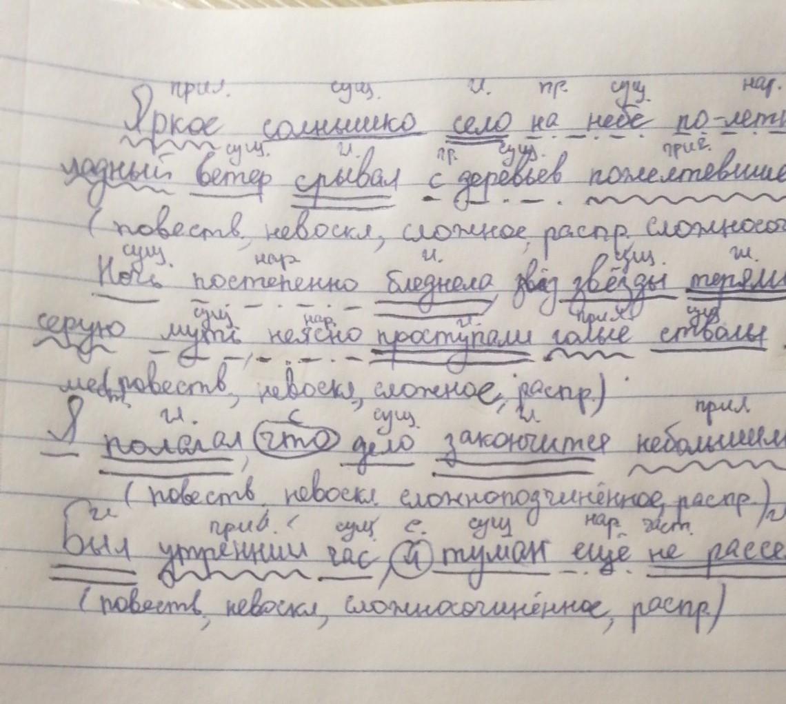 1) Яркое солнышко село на небе по-летнему, но прохладнный осенний ветер срывал с деревьев пожелтевшие листья. (Н. Носов) 2) Ночь постепенно бледнела, звёзды