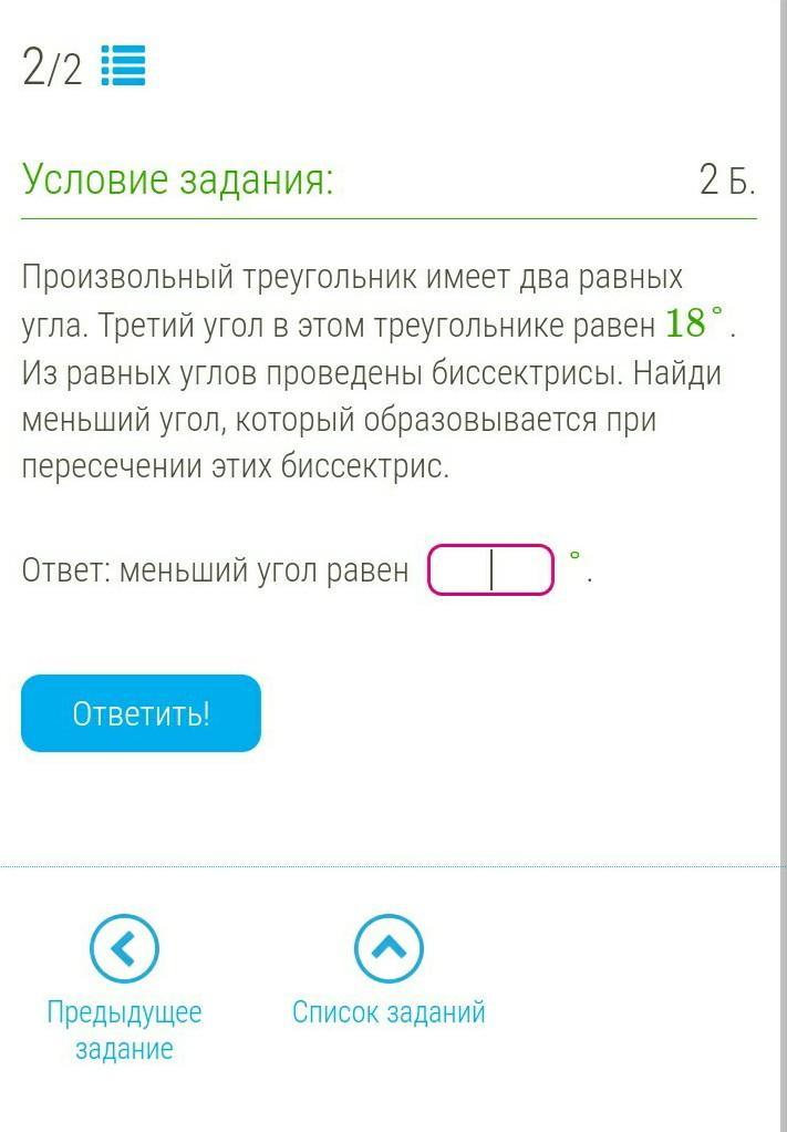 180°-18°=162°- сума двух углов 162°÷2=81° 81°÷2=40,5- за властивостью биссектрисы 180°-(40,5+40,5)=99° 180°-99°=81°- как сумежные