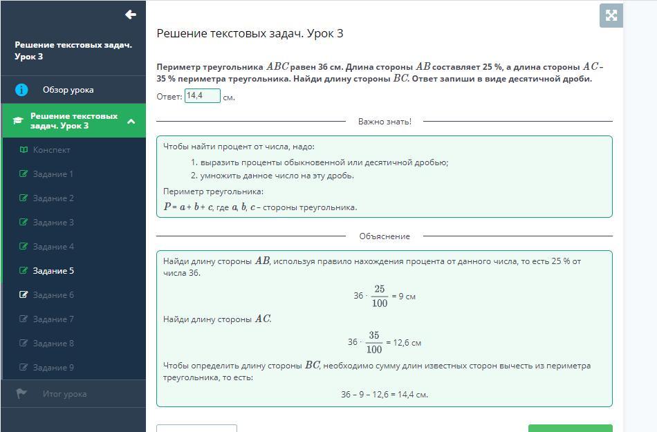 Периметр треугольника ABC равен 36 см. Длина стороны AB составляет 25 %, а длина стороны AC – 35 % периметра треугольника. Найди длину стороны BC. Ответ запиши в виде десятичной дроби.