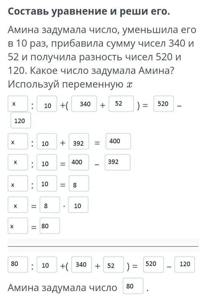 Амина задумала число, уменьшила его в 10 раз, прибавила сумму чисел 340 и 52 и получила разность чисел 520 и 120. Какое число задумала Амина? Используй переменную x