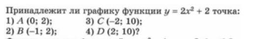 підставляєш x,y у функцію і якщо виходить правильна рівність,то так дана точка належить графіку функції ,якщо не правильна рівність,то ні ця точка не належить графіку
