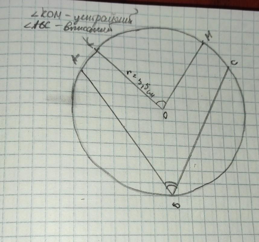 Начерти окружность радиусом 3,5 см, покажи вписанный в него угол АВС, покажи центральный угол КОМ.