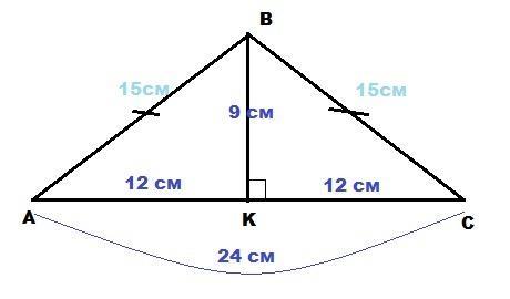 Т.к. у равнобед.треу. высота делит основание пополам то основание разделилось на два отрезка по 12 см