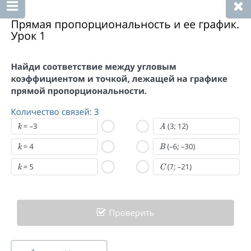Найди соответствие между угловым коэффициентом и точкой, лежащей на графике прямой пропорциональности.