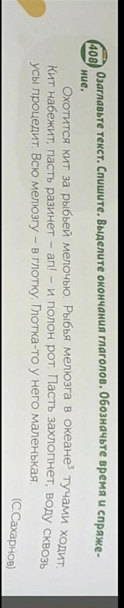 Охотится (2-е спряжение, наст.в.) кит за рыбьей мелочью. Рыбья мелюзга в океане тучами ходит (2-е спряжение, наст.в.). Кит набежит (2-е спряжение, буд.в.), пасть разинет (1-е спряжение, буд.в) - ап! - и полон рот. Пасть захлопнет (1-е спряжение, буд.в.), воду сквозь усы процедит (2-е спряжение, буд.в.). Всю мелюзгу - в глотку. Глотка-то у него маленькая.