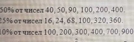 . 1) 50% от чисел 40, 50, 90, 100, 200, 400. 2) 25% от чисел 16, 24, 68, 100, 320, 360. 3) 10% от чисел 100, 200, 300, 400, 700, 900.