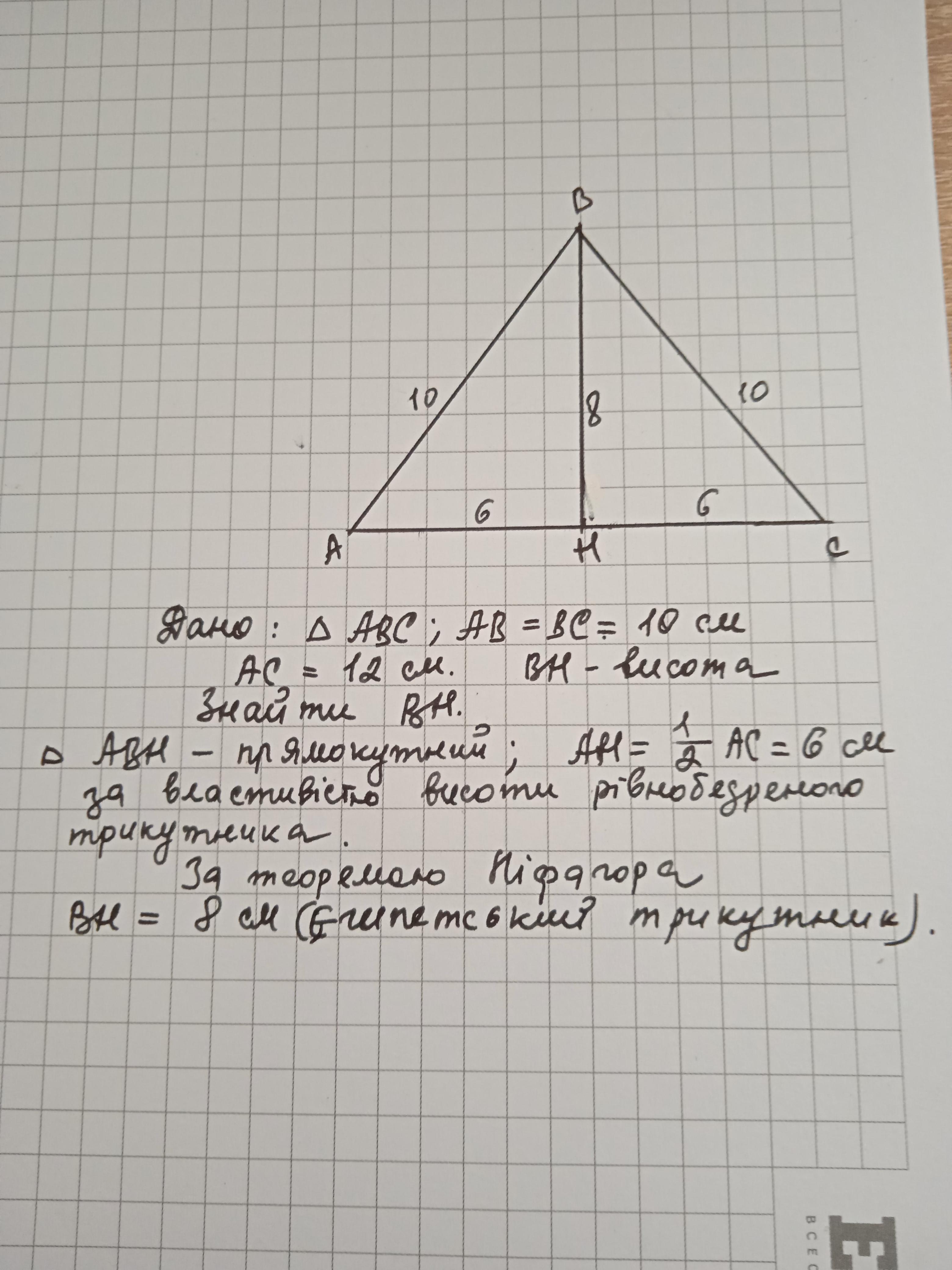 у рівнобедреному трикутнику основа і бічна сторона дорівнюють відповідно 12 см і 10 см. висота, опущена на його основу і дорівнює..