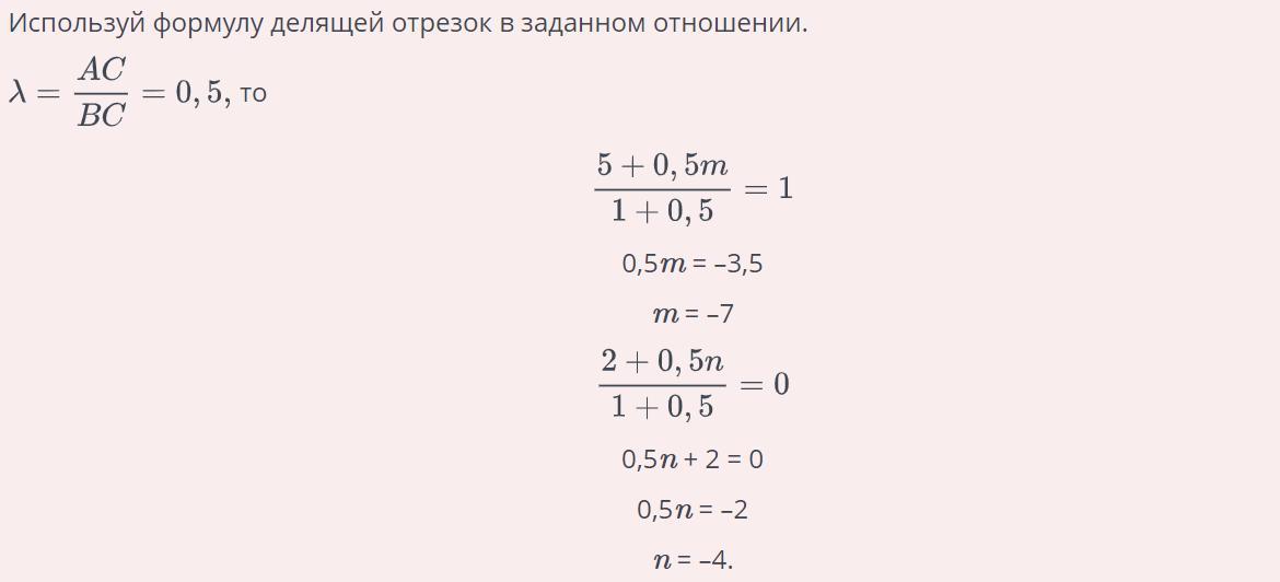 Координаты концов отрезка AB равны A(5; 2), B(m; n). Точка C делит отрезок AB в отношении 1 : 2. Координаты точки C(1; 0). Найди значения m и n.