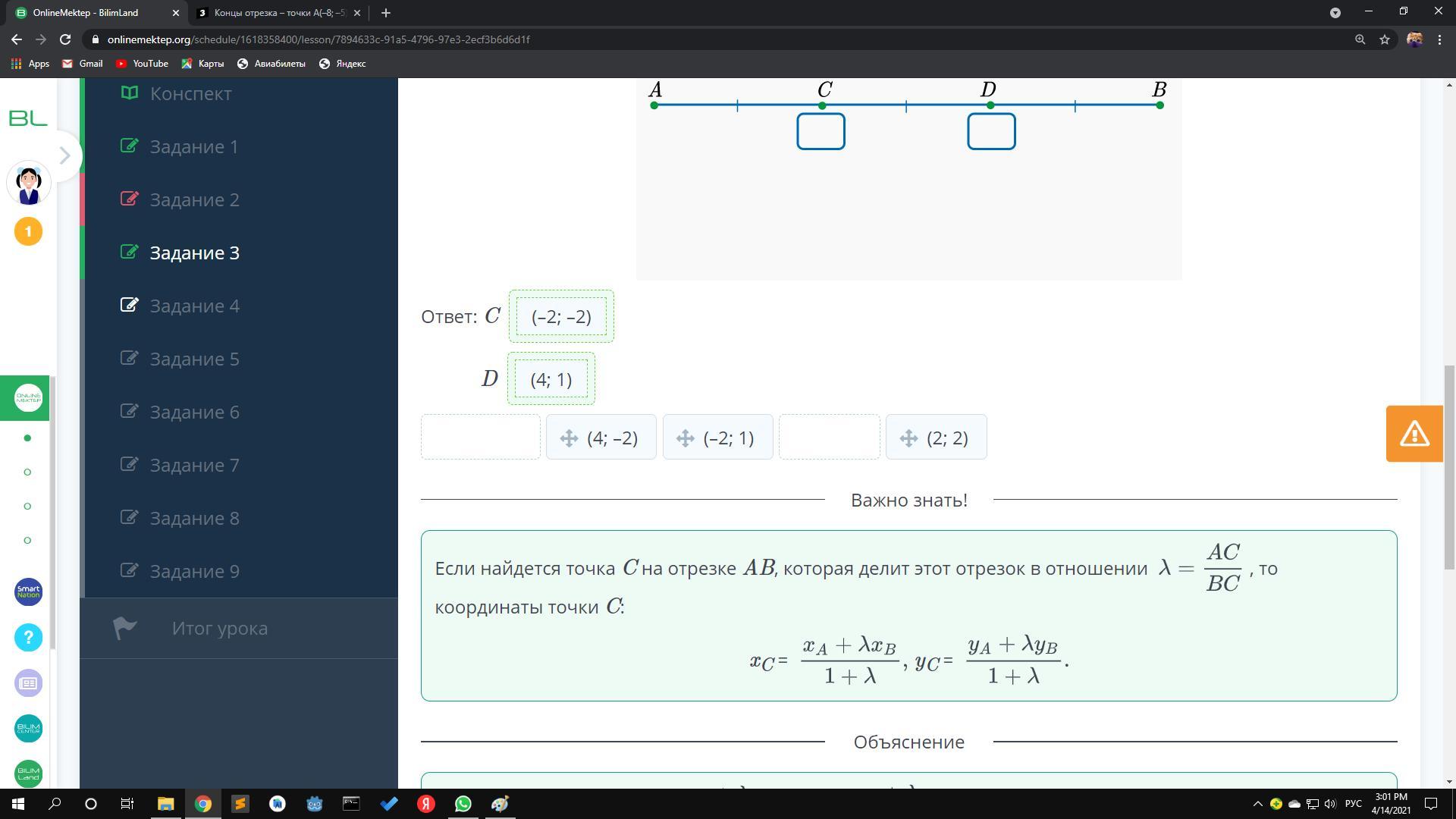 Концы отрезка – точки A(–8; –5) и B(10; 4). Найди точки C и D, которые делят этот отрезок на три равные части.