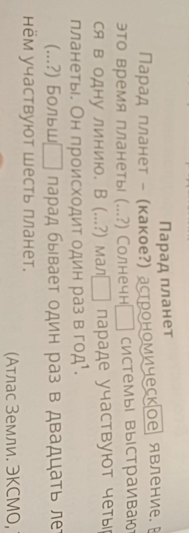 Парад планет-(какое?) астрономическое явление.В это время планеты(какой?) Солнечной системы выстраиваются в одну линию.В(каком?)малом параде участвуют четыре планеты.Он происходит один раз в год.