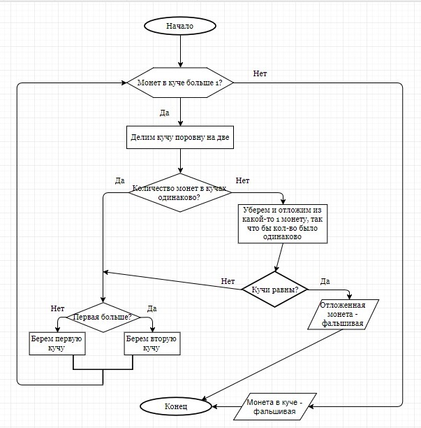 Нарисуйте блок-схему алгоритма поиска фальшивой монеты среди десяти монет. В вашем распоряжении имеются лабораторные весы (с двумя чашечками) без гирь. Известно, что фальшивая монета всего одна, и она легче настоящих.