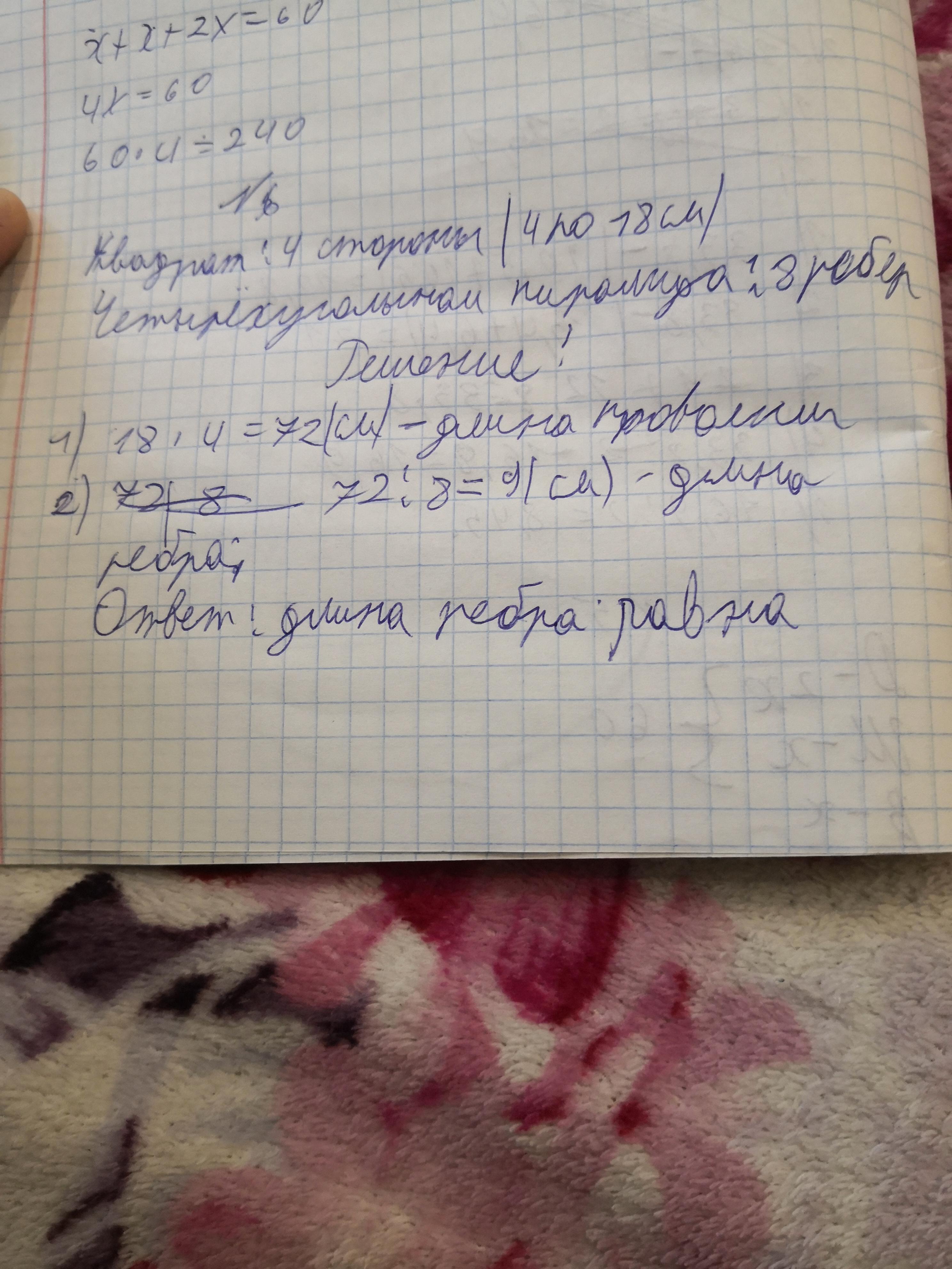Помогите пожалуйста: Чтобы сформировать четырехугольную пирамиду со всеми ребрами одинаковой длины, использовали кусок проволоки, из которого можно сделать квадрат со стороной 18 см. Найдите длину ребра пирамиды. Кто решит даю 30 баллов!!!