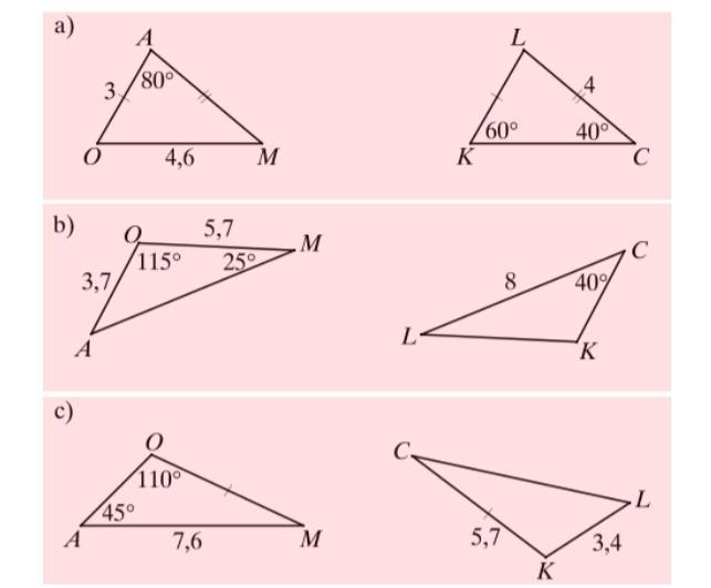 Треугольник AOM равен треугольнику LKC. Напишите, чему равны неизвестные стороны и неизвестные углы обоих треугольников.