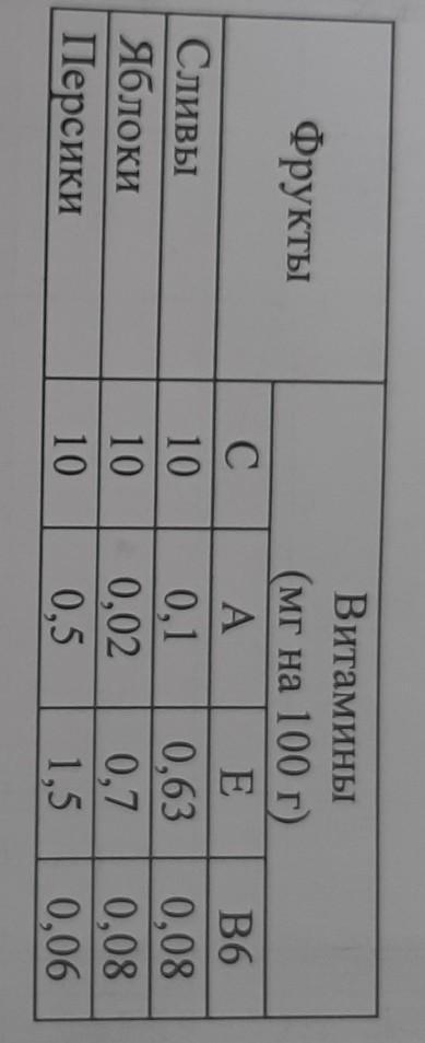 в таблице указано содержание витаминов (в миллиграммах) в 100 г фруктов. Какое