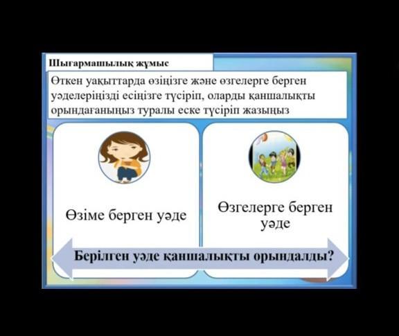Мен берілген уəдені 100% орындадым. Ата-анама көмектестім. Сөзімде тұрдым. Ал өзіме келетін болсақ мен сабағымды оқитын оқушымын.