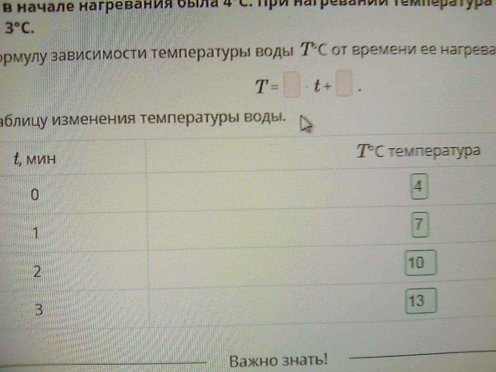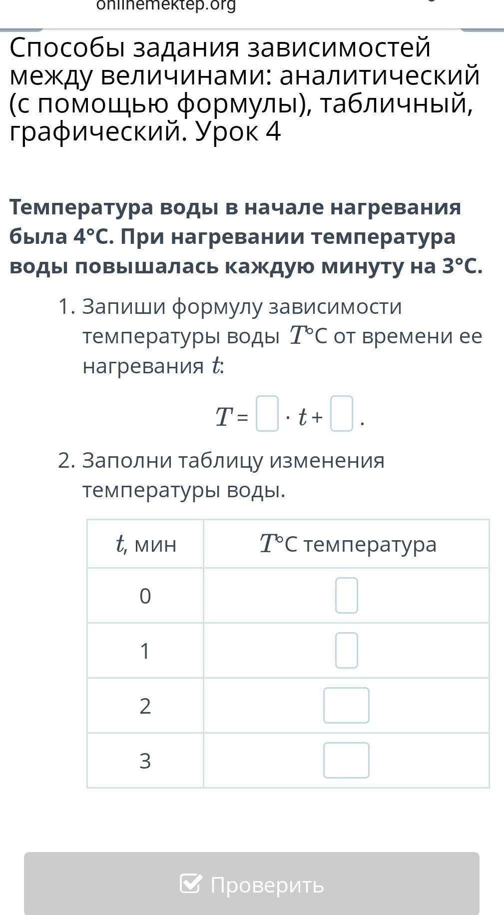 Запиши формулу зависимости температуры воды T°C от времени ее нагревания t: