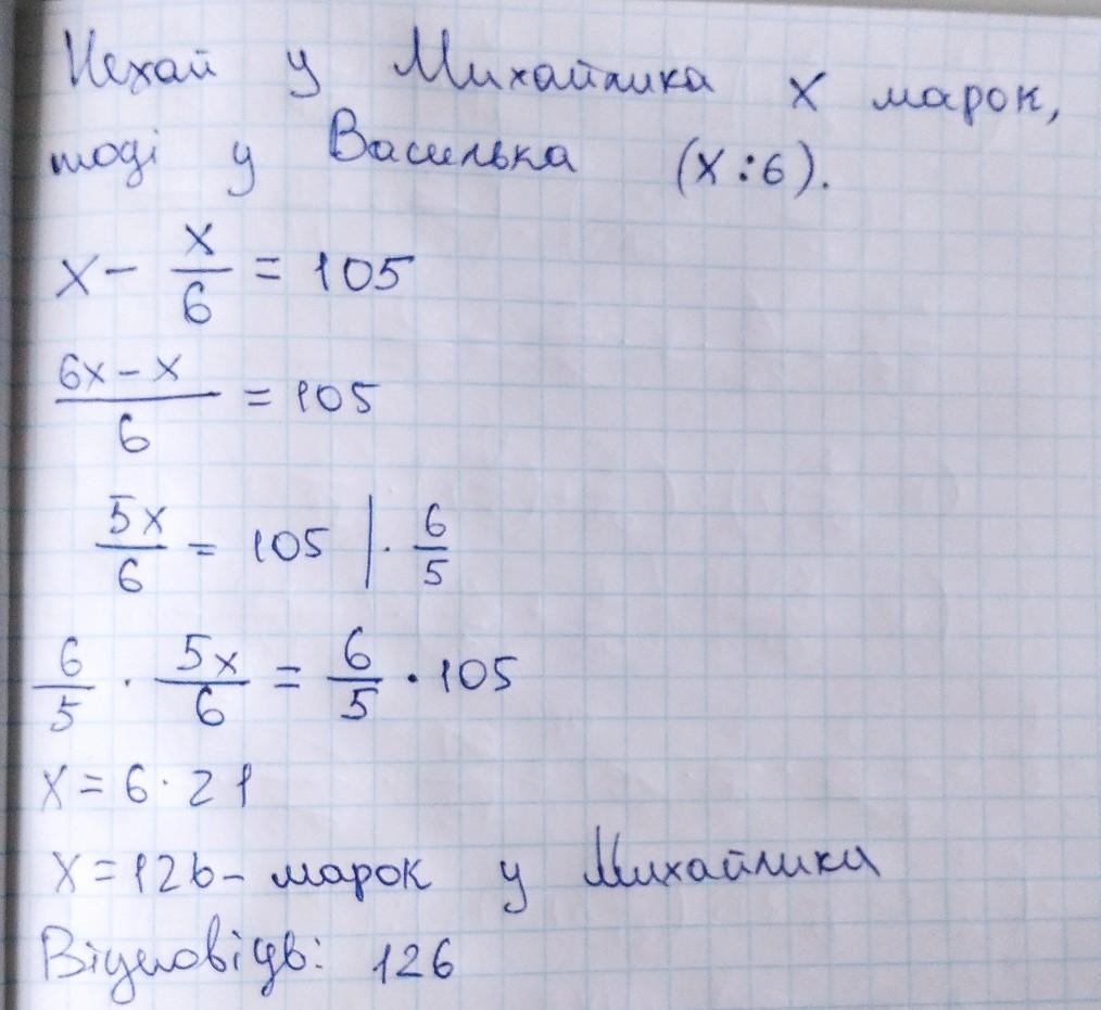 у Василька в 6 разів меньше марок, ніж у Михайлика. Скільки марок у Михайлика якщо у нього на 105 більше, ніж у василька