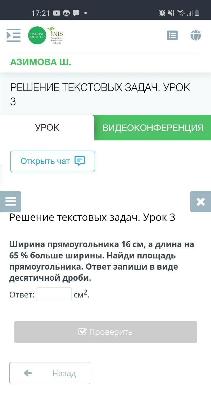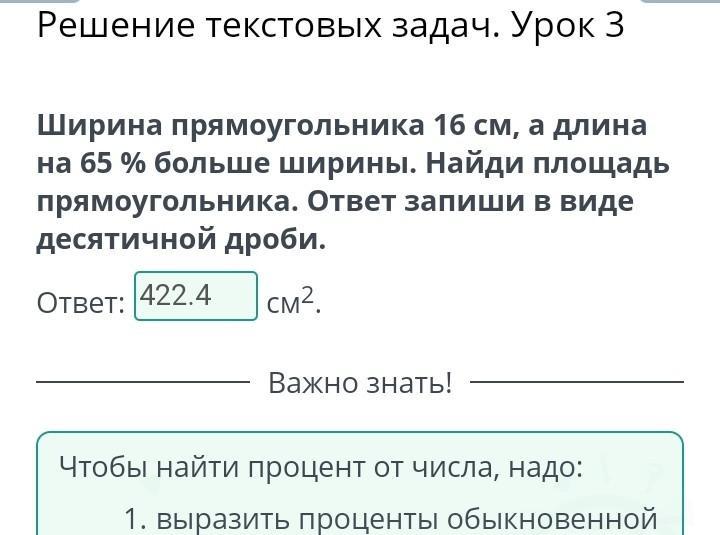 Ширина Зямоугольника 16 см, а длина на 65 % больше ширины. Найди площадь прямоугольника.