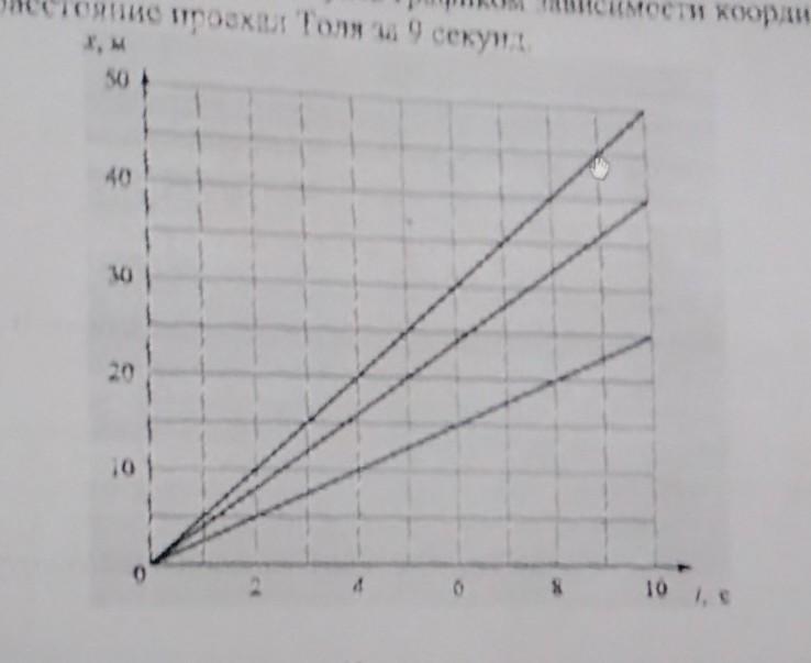 Толян Надя и Серёжа устроили велосипедные гонки Толи Обогнал Надю, Серёжа тоже Обогнал, но отстало от Толи Пользуясь графиком используя координаты от времени определите Какое расстояние проехал Толя за 9 секунд