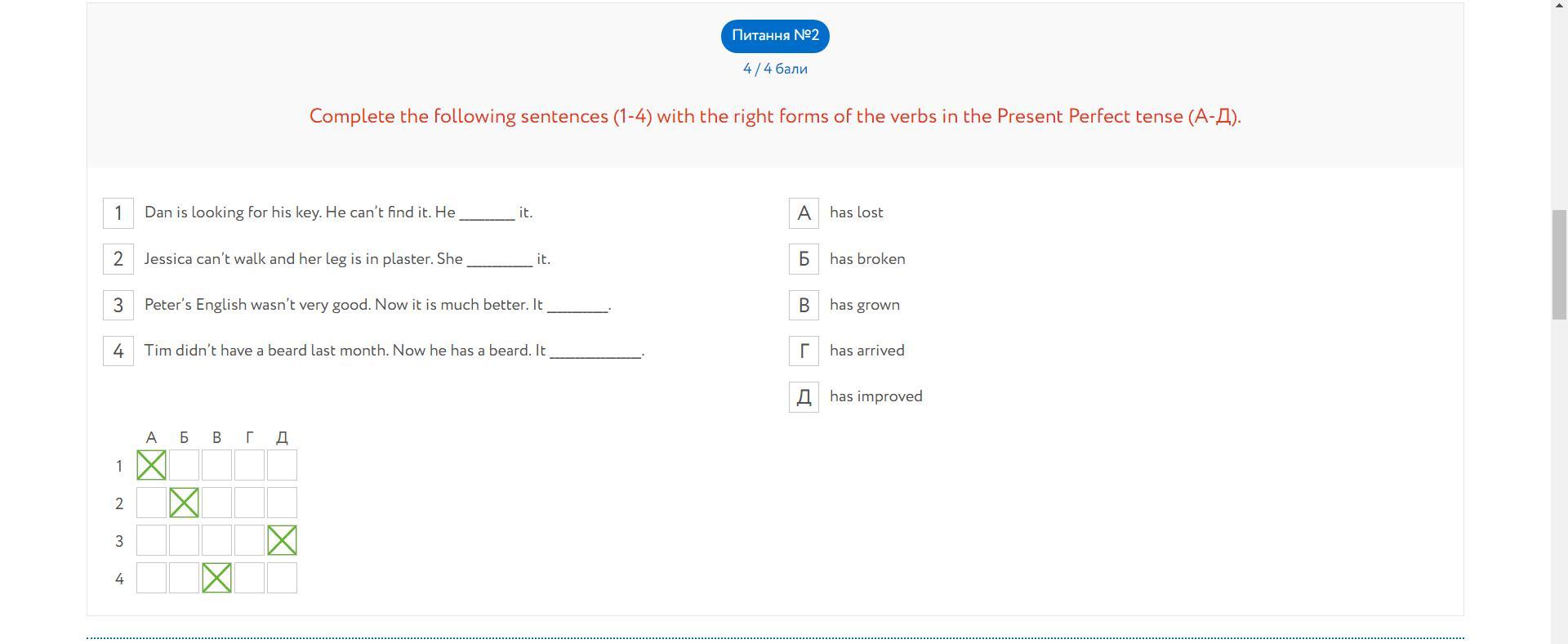 Complete the following sentences (1-4) with the right forms of the verbs in the Present Perfect tense (A-Д).