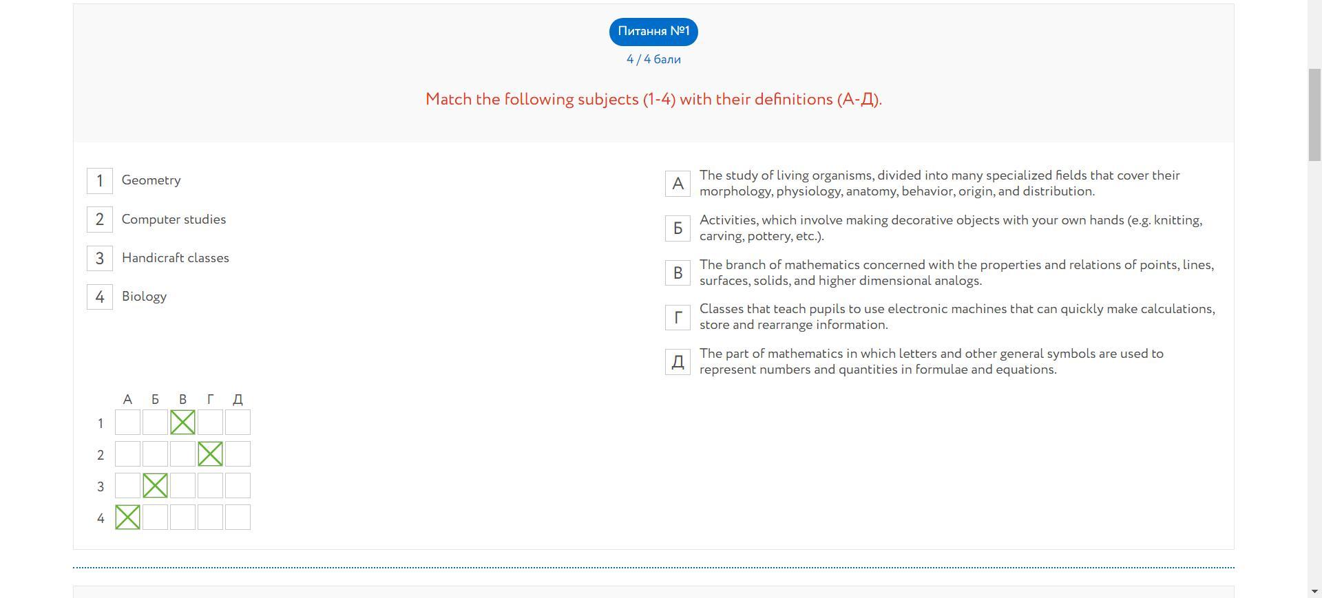 Match the following subjects (1-4) with their definitions (A-Д).