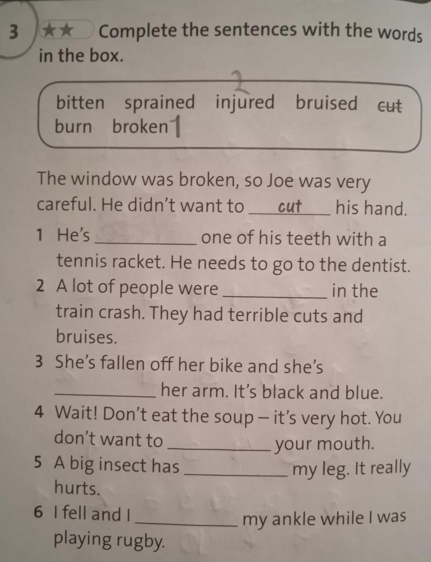 1. broken 2. injured 3. bruised 4. burn 5. bitten 6. sprained