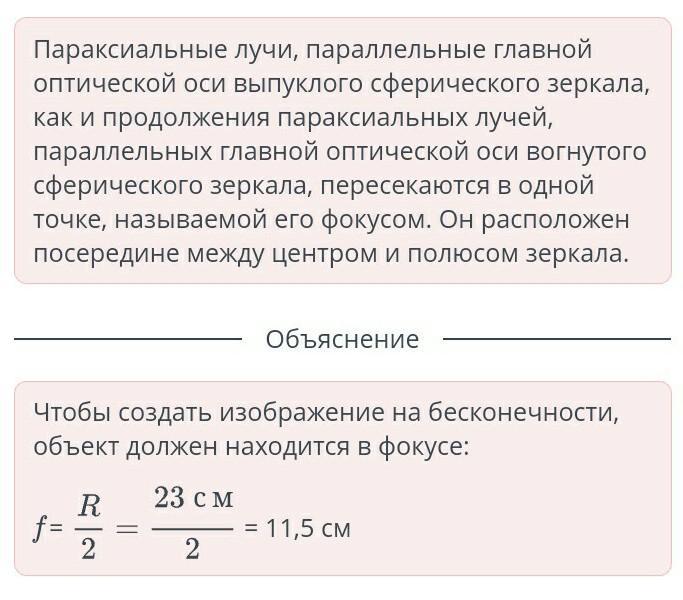 на каком расстоянии от вогнутого зеркала ( радиус 23см)должен быть размещён объект, чтобы его изображение находилось на бесконечности (ответ округли до десятых)