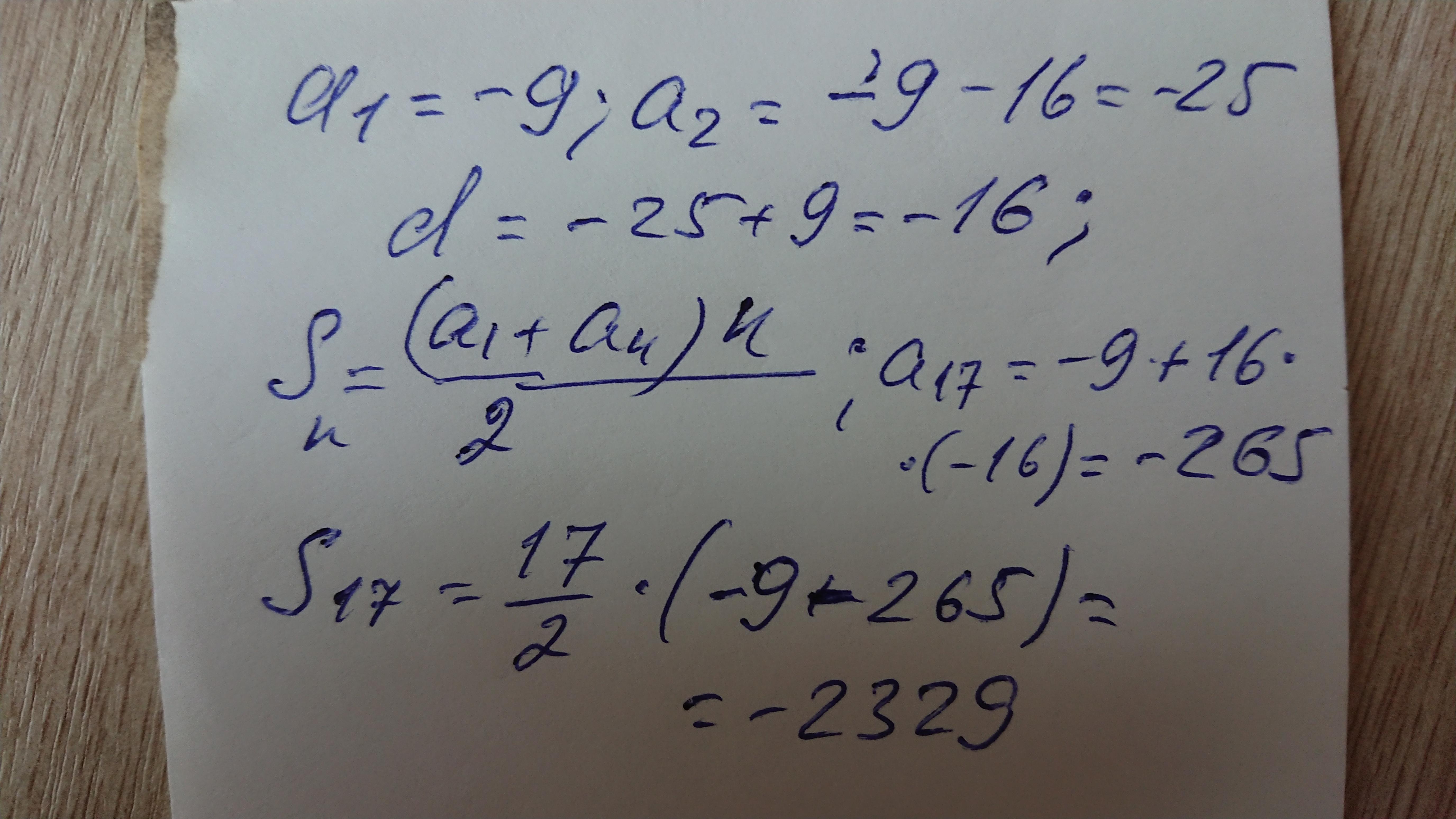 Арифметическая прогрессия задана условиями a1=−9 , an+1=an-16 . Найдите сумму первых 17 её членов.