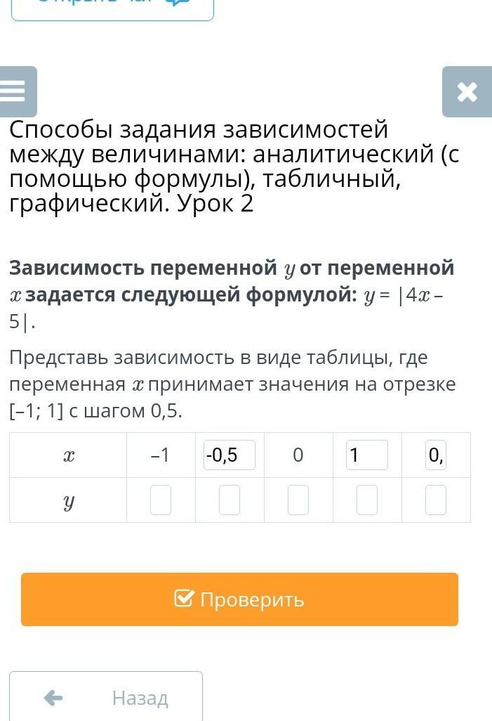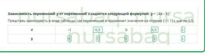 Представь зависимость в виде таблицы, где переменная x принимает значения на отрезке [–1; 1] с шагом 0,5.