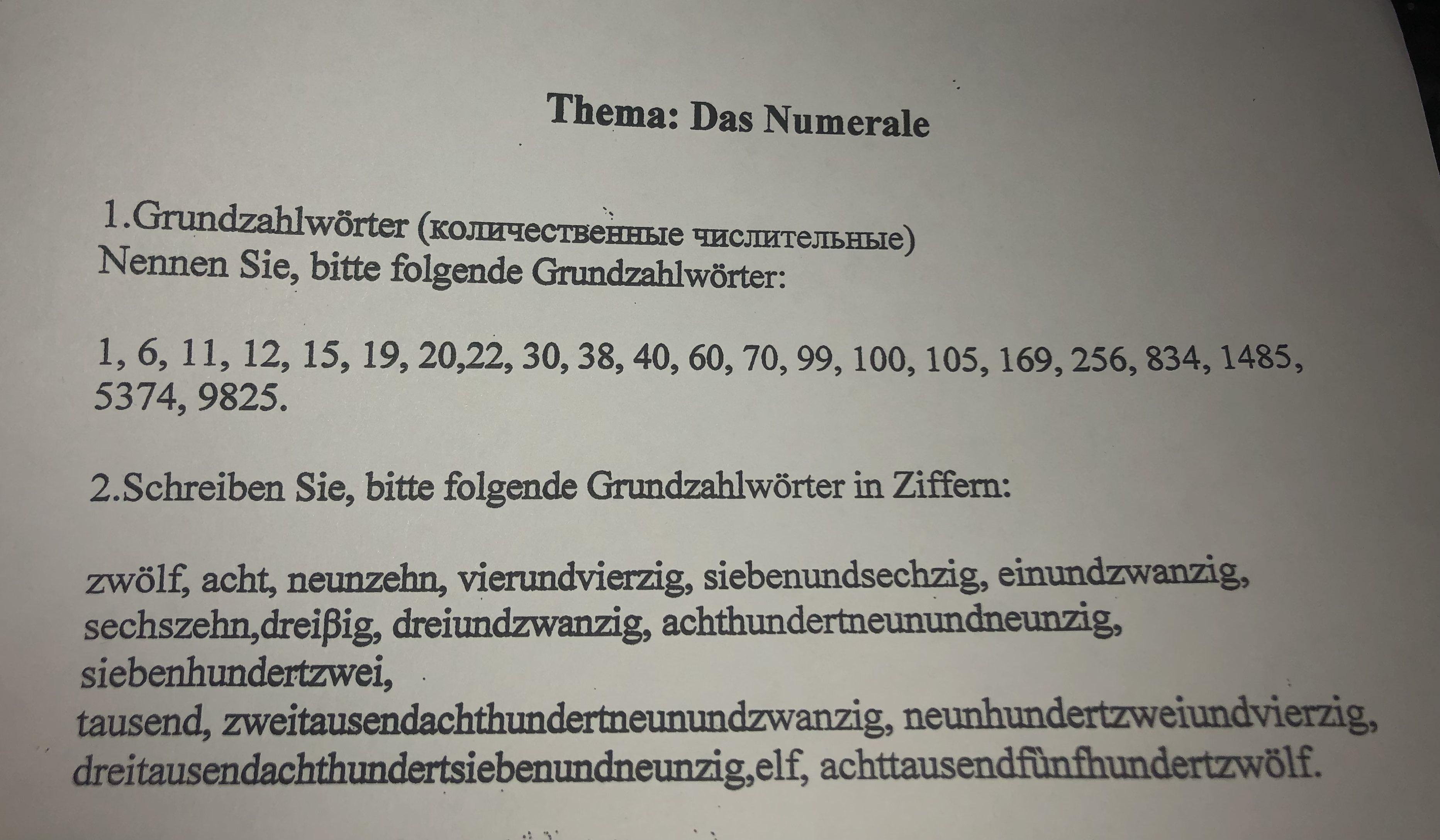 eins, sechs, elf, zwölf, fünfzehn, neunzehn, zwanzig, zweiundzwanzig, dreißig, achtunddreißig, vierzig, sechzig, siebzig, neunundneunzig, hundert, einhundertfünf, einhundertneunundsechzig, zweihundertsechsundfünfzig, achthundertvierunddreißig, eintausendvierhundertfünfundachtzig, fünftausenddreihundertvierunddreißig, neuntausendachthundertfünfundzweizig.