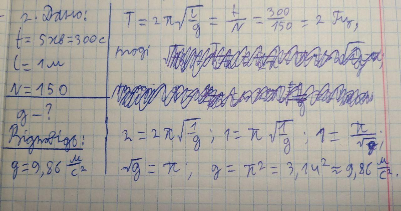 При дослідному визначенні прискорення сили тяжіння учень нарахував 150 повних коливань маятника за 5 хв. Яке визначене ним значення д, якщо довжина маятника 1м? (Відповідь: 9,86м/с2)
