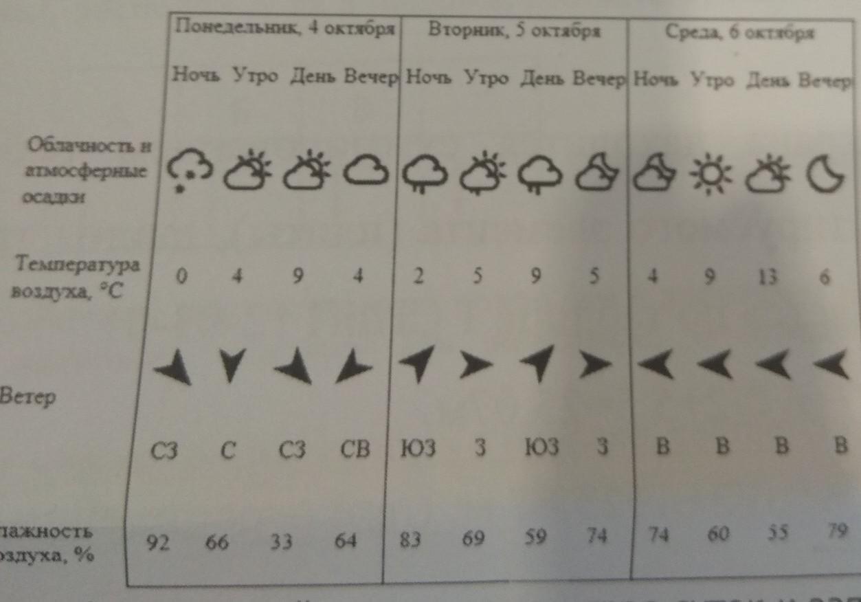На интернет-сайтах погоды можно встретить подобные таблицы. Внимательно изучи прогноз погоды на трое