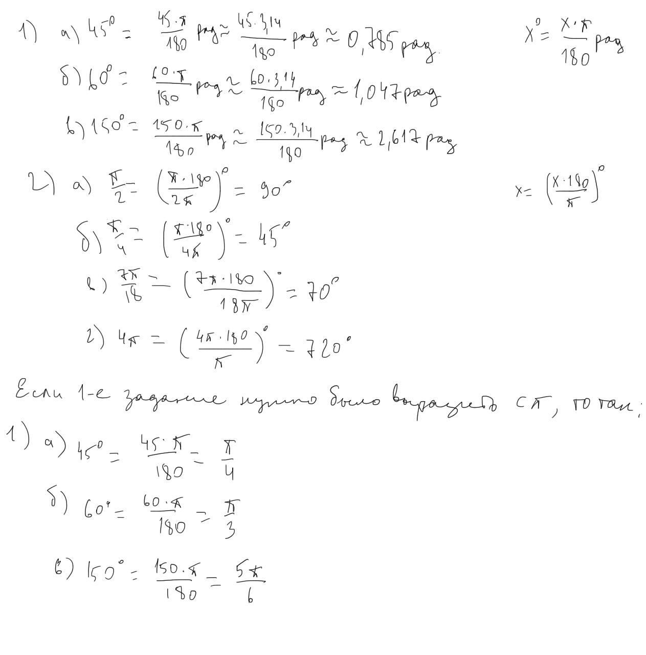 1)Найдите радианную велечину углов в: а) 45° ; б) 60° ; в) 150° .