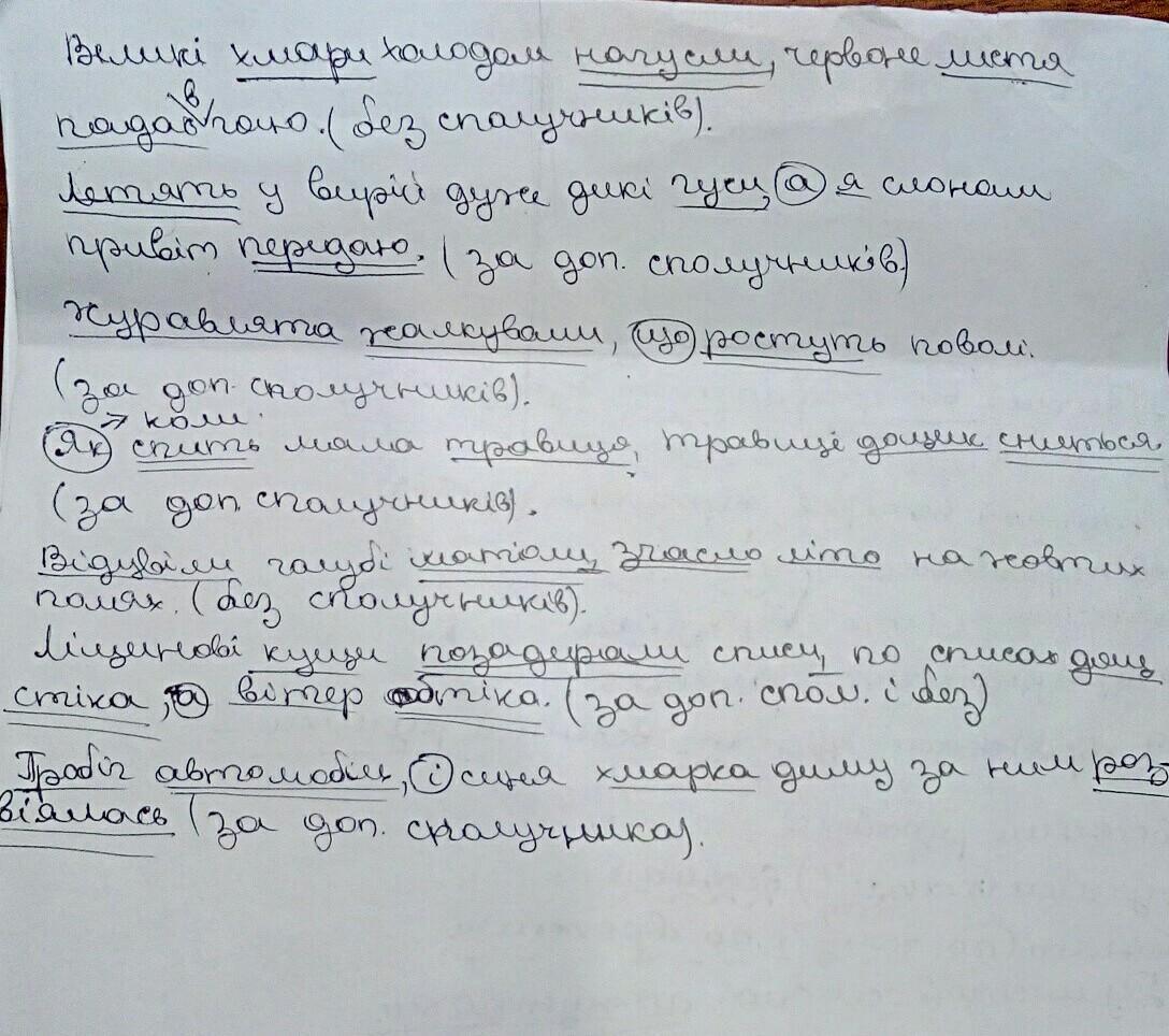 1. Записати речення. Визначити та підкреслити в кожному граматичні основи, пояснити, як пов’язані прості речення у складне: без сполучників чи за допомогою сполучників (сполучних слів)? Великі хмари холодом нагусли, червоне листя падає в гаю. Летять у вирій дуже дикі гуси, а я слонам привіт передаю. (Л. Костенко.) Журавлята жалкували, що ростуть вони поволі. (М. Сингаївський.) Як спить мала травиця, травиці дощик сниться. (А. М’ястківський.) Відцвіли голубі матіоли, згасло літо на жовтих полях. (В. Грінчак.) Ліщинові кущі позадирали списи, по списах дощ стіка, а вітер обтіка. (Є. Гуцало.) Пробіг автомобіль, і синя хмарка диму за ним розвіялась. (М. Рильський.)