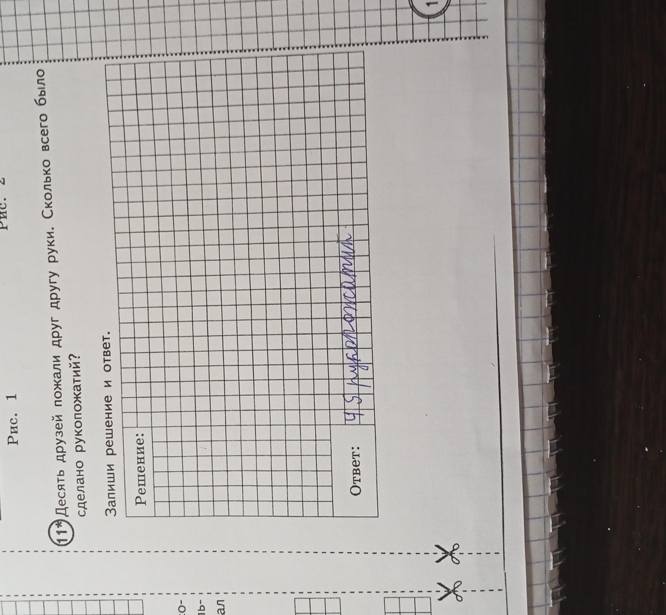 Или же один человек пожал руки девятерым людям, так как сам себе он пожать не может, значит рукопожатий было 10*9=90, но так как в рукопожатии участвуют 2 человека, то 90/2=45 рукопожатий.
