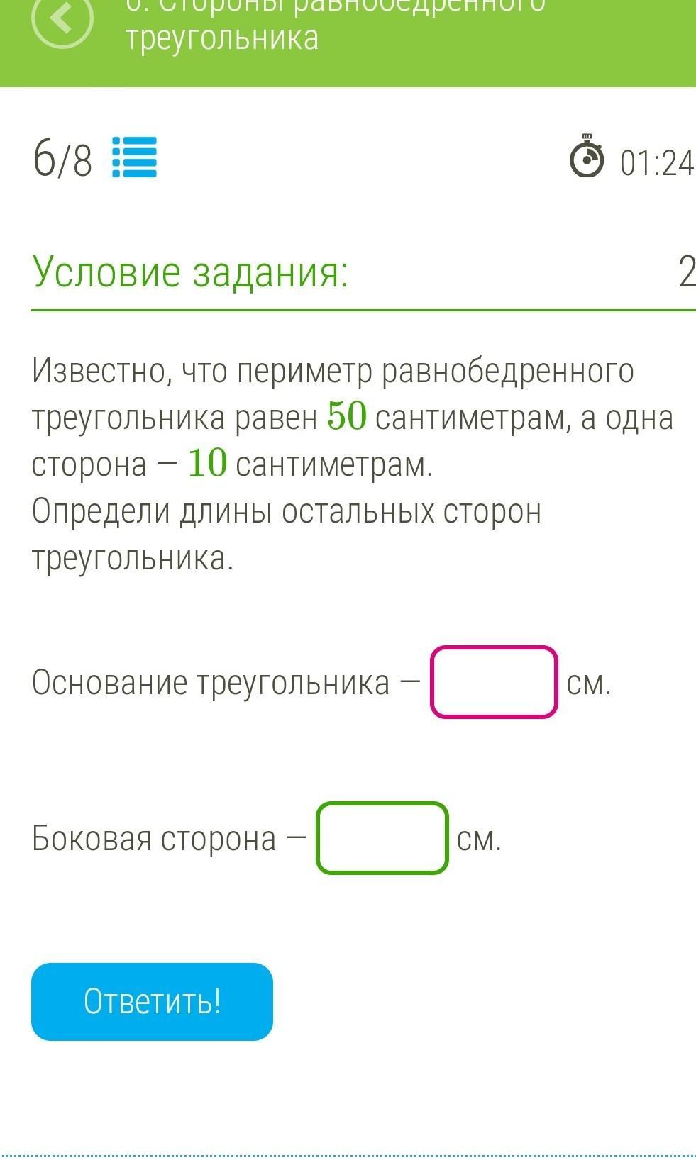 У равнобедренного треугольника боковые стороны равны, но это не могут быть 10см, потому что 10+10<30, потому что длина любой стороны треугольника не может быть больше суммы длин двух других сторон. Значит основание равно 10см, а боковые по 20см, (50-10)÷2=20см.
