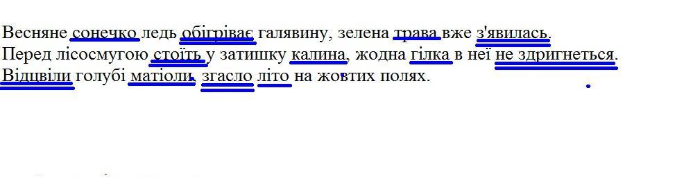 Укр.мова. Переписати ЛИШЕ!!! складні речення, які поєднані безсполучниковим зв'язком . Підкреслити граматичні основи. Весняне сонечко ледь обігріває галявину, зелена трава вже з'явилась. Перед лісосмугою стоїть у затишку калина, жодна гілка в неї не здригнеться. Журавлята жалкували, що ростуть вони поволі. (М. Сингаївський.) В калини про зозулю я питаю, але калина не відповідає. (Є. Гуцало.) Я тут придивляюся до різнотрав’я, прислухаюсь до вітру. Відцвіли голубі матіоли, згасло літо на жовтих полях. (В. Грінчак.)