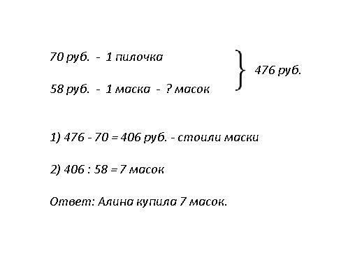 Алина купила увлажняющие маски для лица и пилочку для ногтей и заплатила за всю покупку 476 рублей. Сколько увлажняющих масок по 58 рублей купила Алина, если за пилочку она заплатила 70 рублей?