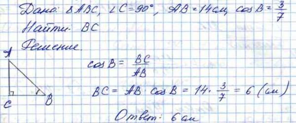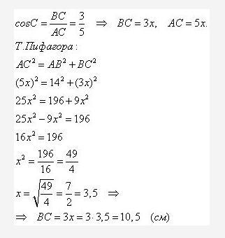 В треугольнике ABC угол C=90°, АВ=14см, cosB=3/7 . Найди ВС