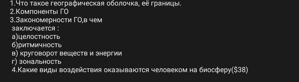 1.Географическая оболочка — это комплексная оболочка земного шара, где соприкасаются и взаимно друг в друга проникают и взаимодействуют литосфера, гидросфера, биосфера и атмосфера. Географическая оболочка в своих границах почти совпадает с биосферой.