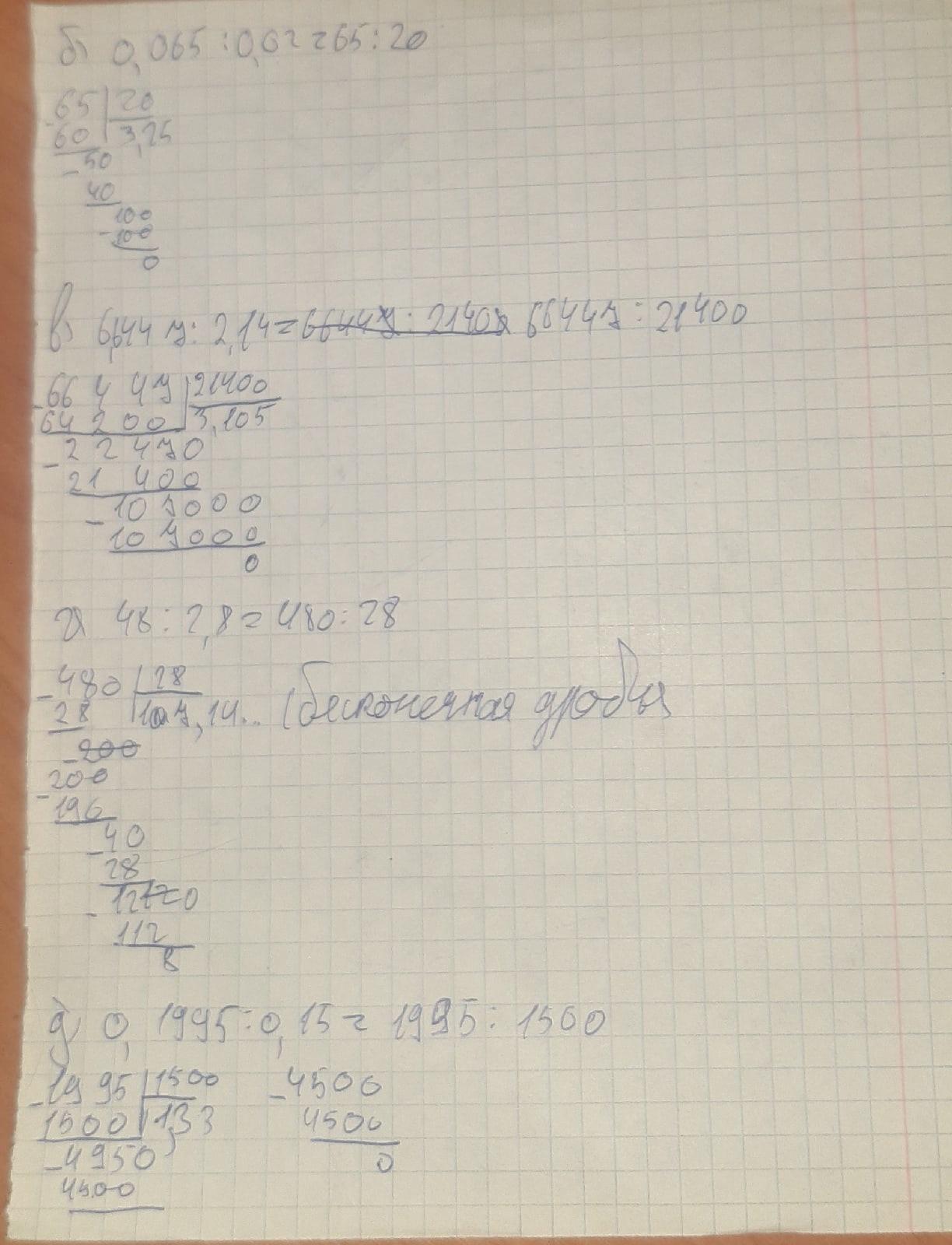 Вычислите а)32,22 : 0,9 б)0,065 : 0’02 в ) 6,6447 : 2,14 г) 48 : 2,8 д)0,1995 :0,15