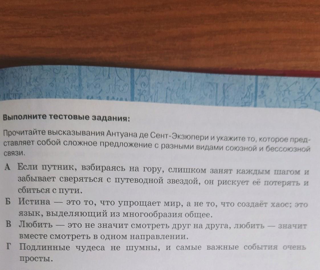 Прочитайте высказывания Антуана ее Сент-Экзюпери и укажите то, которое представляет собой сложное предложение с разными видами союзной и бессоюзной связи. Ответы должны быть доказательствами.