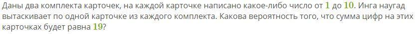 Вероятность выпадения девятки в первом комплекте также равна 0,1, при том, что вероятность выпадения десятки во втором те же 0,1. Вместе 0,01.