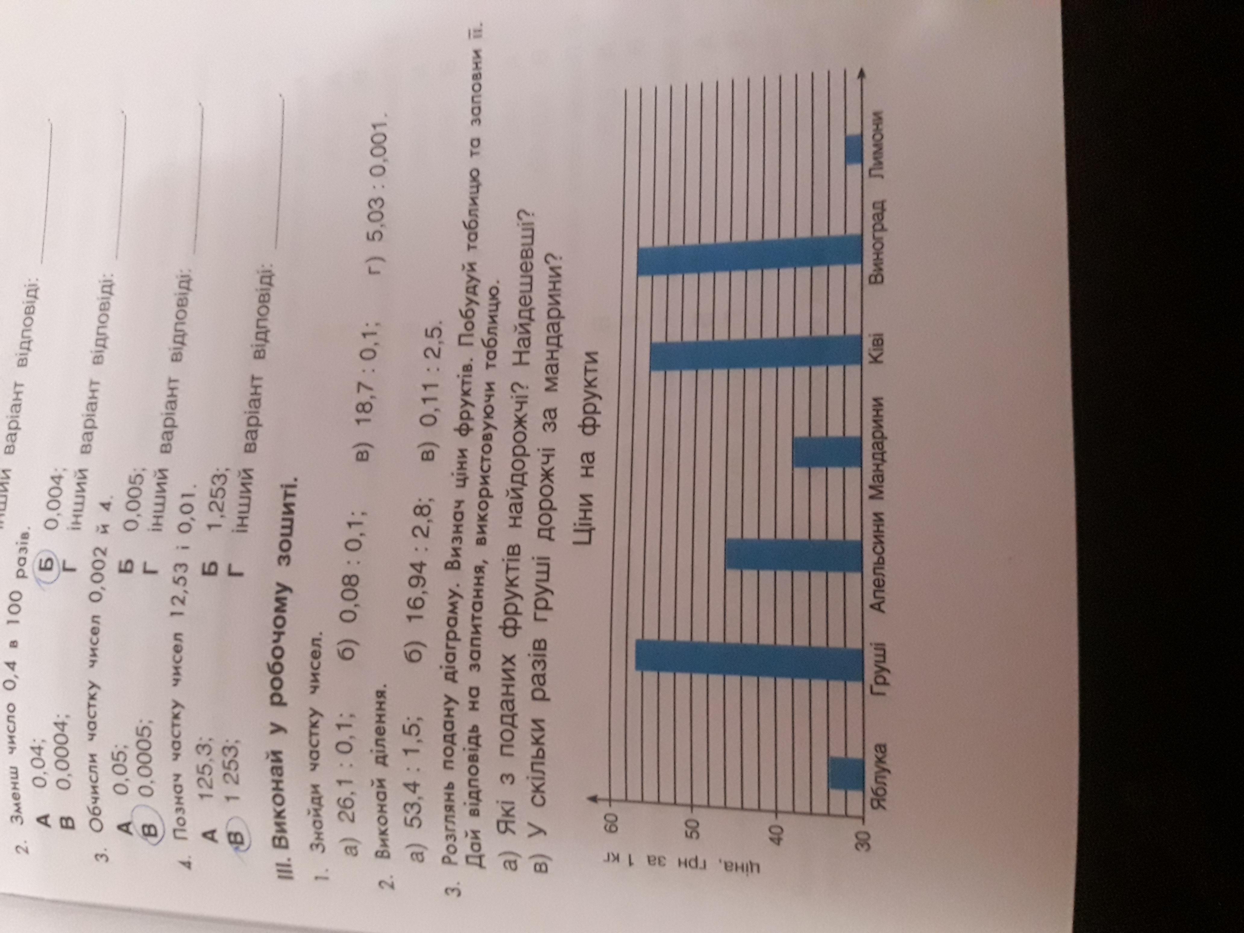 б) Груші 57 грн. Мандарини 38 грн. 57/38=1.5 У 1.5, рази дорожче