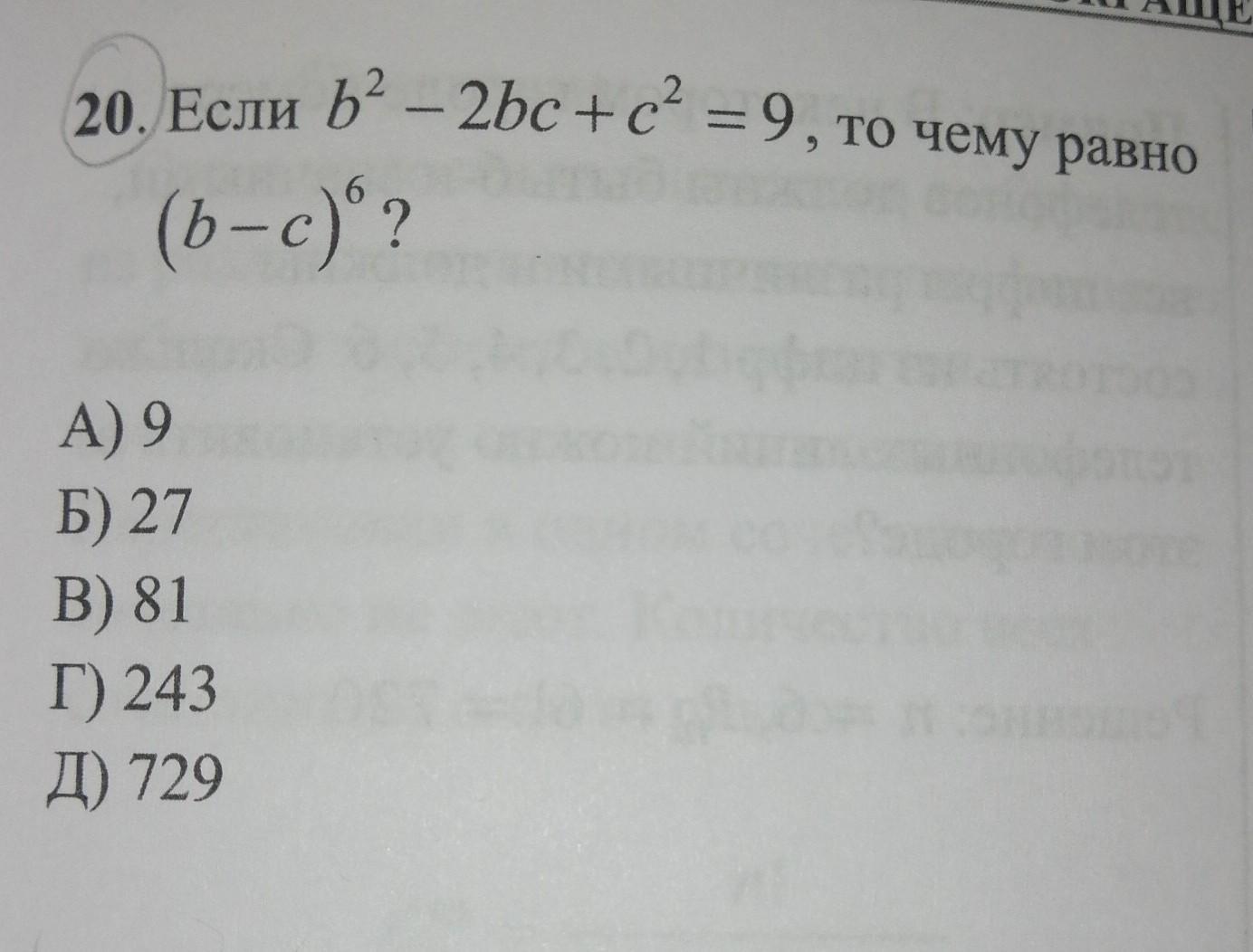 b 2-2bc+c 2=9 (b-c) 2=9 (b-c) 6=729 , т.е.( b-c)=3 3 в 6 степени будет 729
