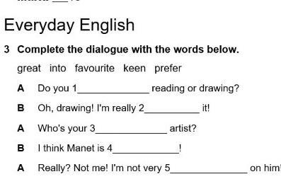 1. prefer 2.keen 3.favourite 4.great 5. into я так думаю можно ЛУЧШИЙ пж
