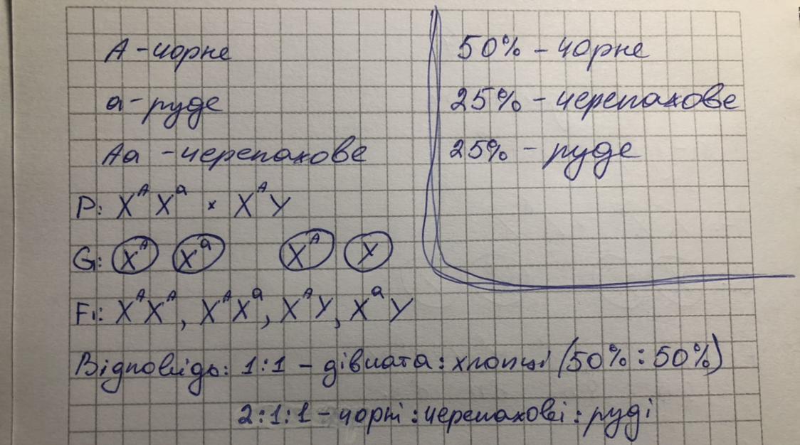 Один из його алелив визначае чорне забарвлення, а другий - руде. У выпадку, якщо организм е гетерозиготою за цим геном, то його забарвлення е черепаховим ( який Колин шерсти матимуть нащадки вид схрещування чорного кота й черепахової кишки?
