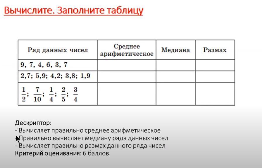 (9; 7; 4; 6 ; 3; 7 ) / 6ср. ариф. / 6,5медиана / 6 размах /