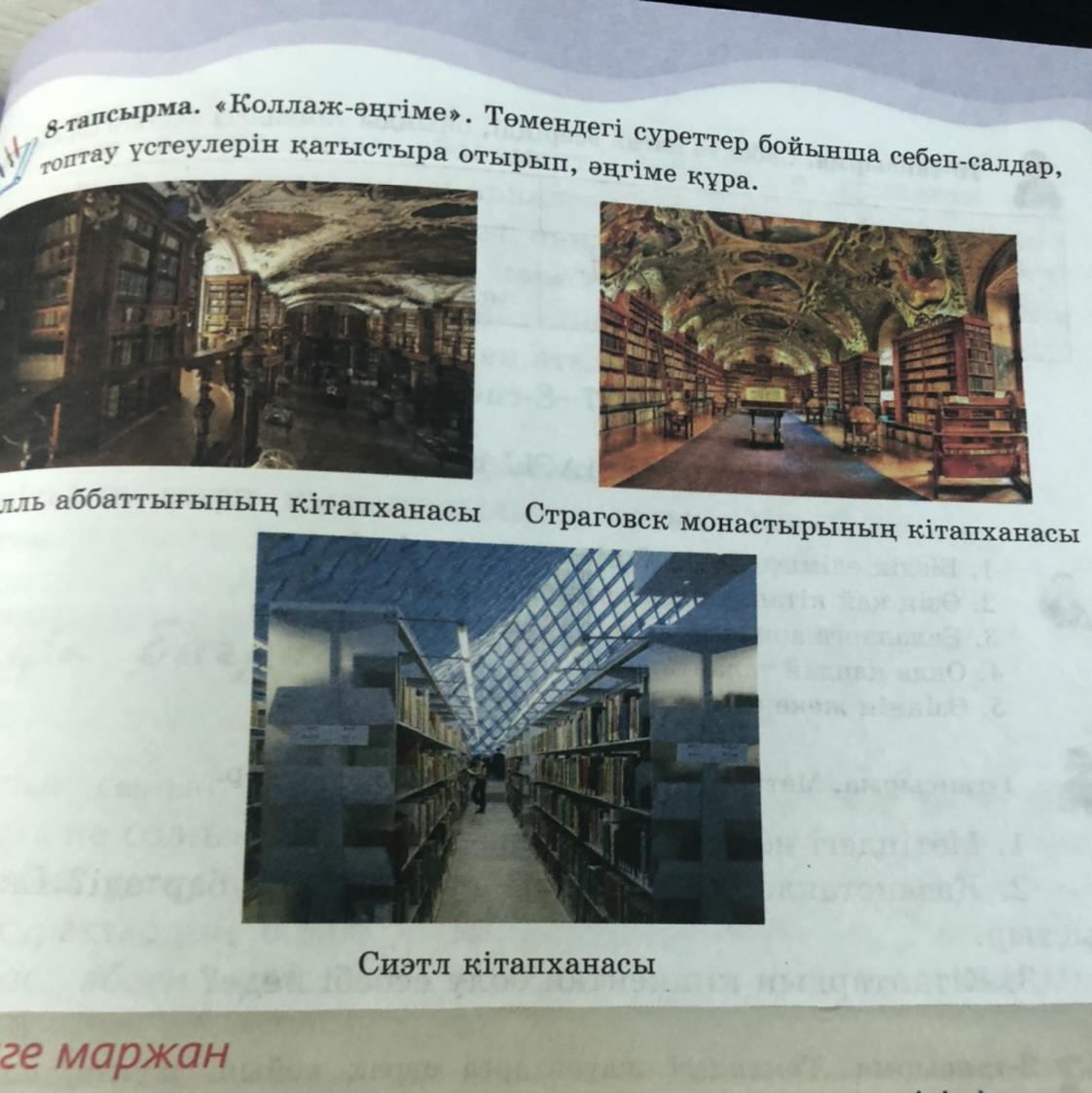 Ответ:Әлемде өте көп кітапхана бар, мысалы "Конгрес" кітапханасы "Сен-Галь" кітапханасы "Страговск" және "Сиэтл" кітапханасы. Олар әлемдегі ең үлкен, ең әдемі кітапхана деп есептеледі.Мен " Конгрес кітапханасын алған себебім ол әлемдегі ең әдемі, үлкен кітапхана болды. Бірақ оны өз заманында өртеп жіберген, сол себепті кітапты оқым аялау керек